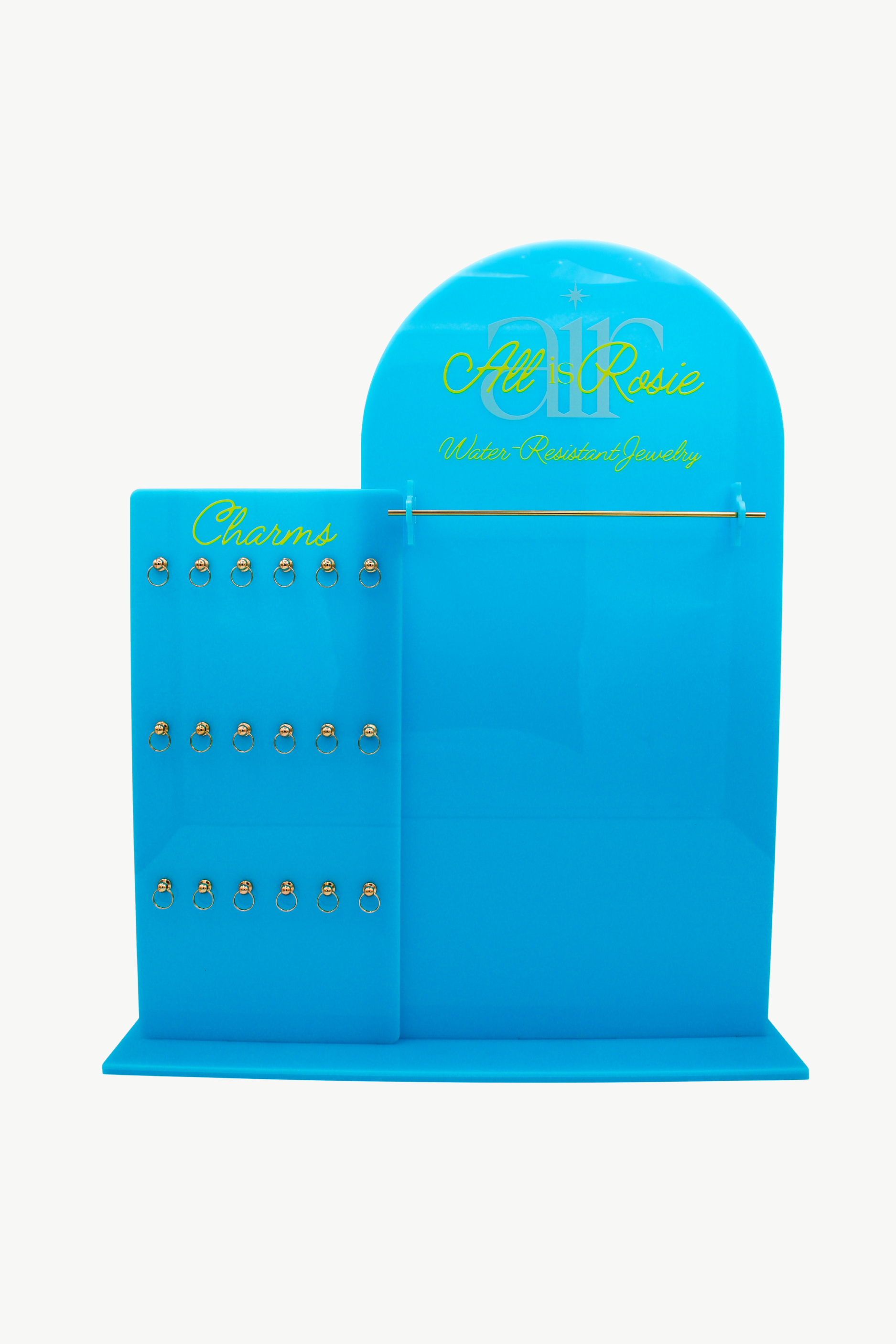 All is Rosie’s custom blue acrylic display features 18 bestselling charms and 20 water-resistant chains for endless mix-and-match options. Includes secure charm rings and a closed-ended necklace bar to deter theft. A vibrant, space-saving, and eye-catching setup!