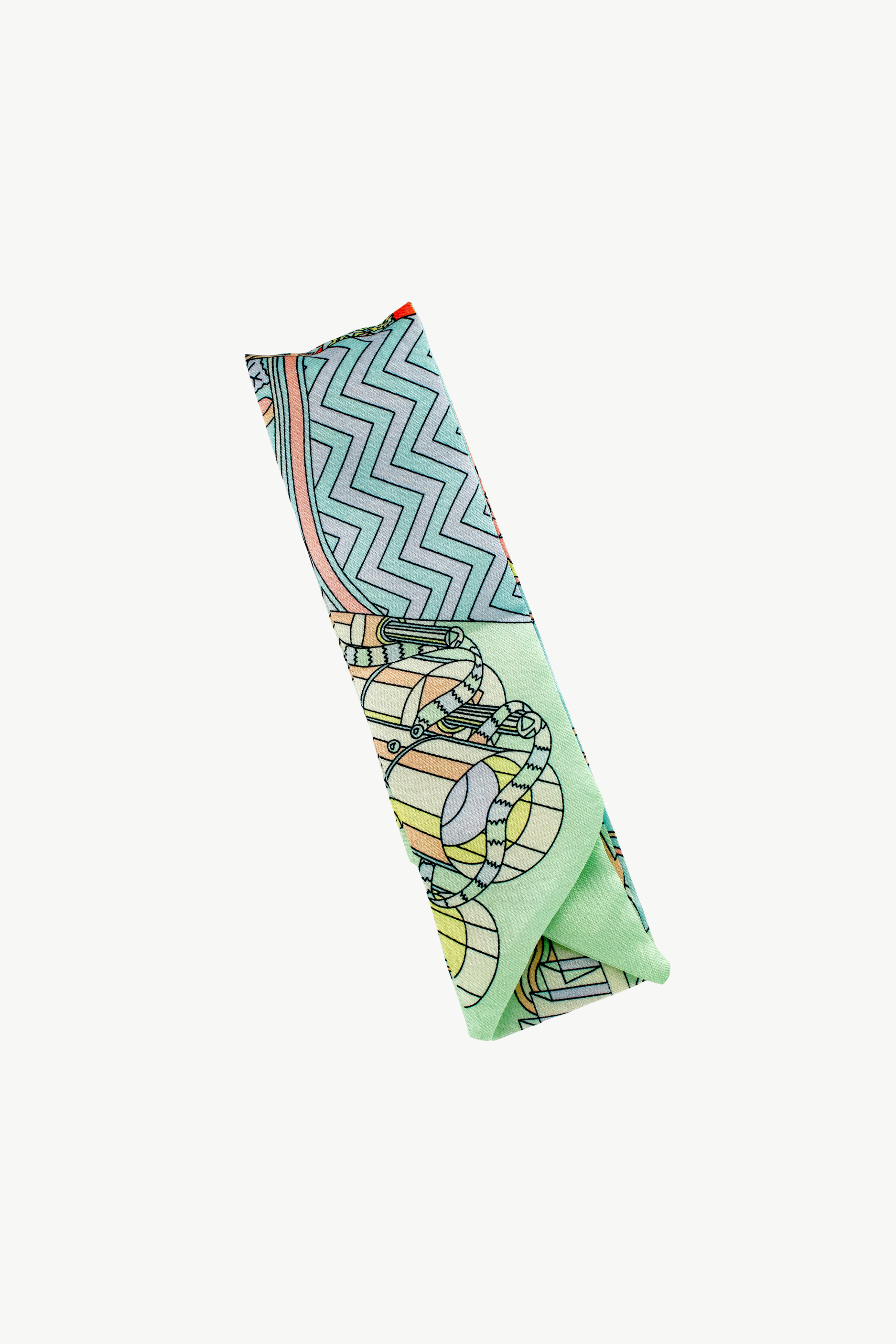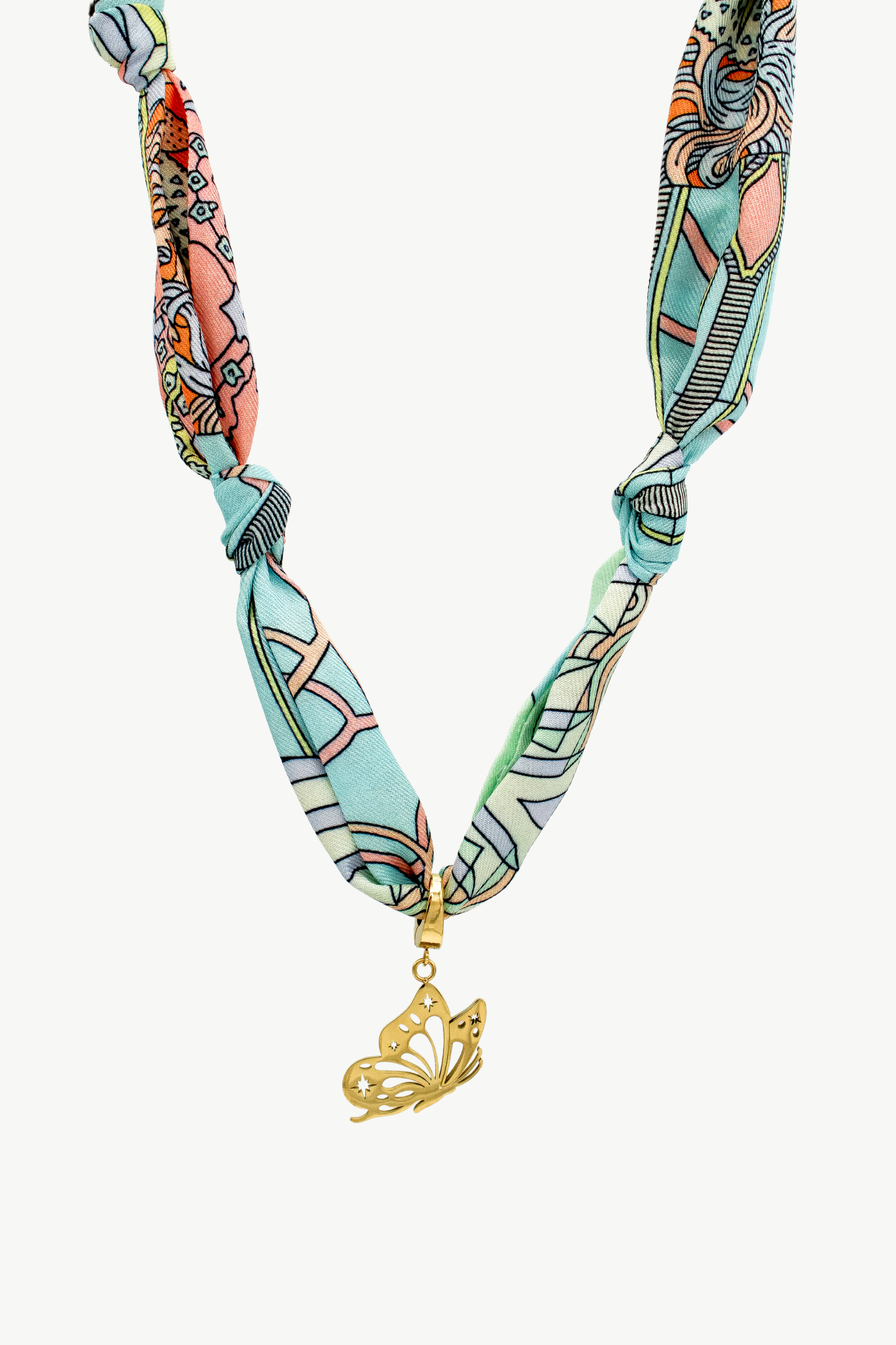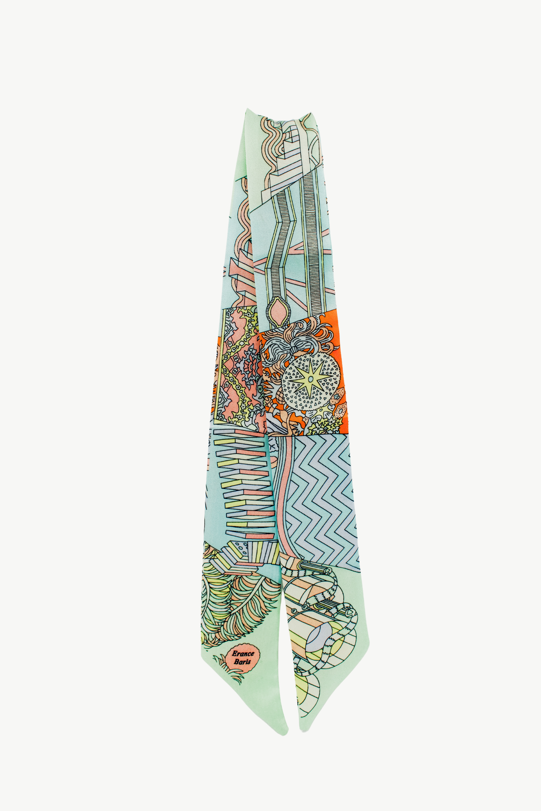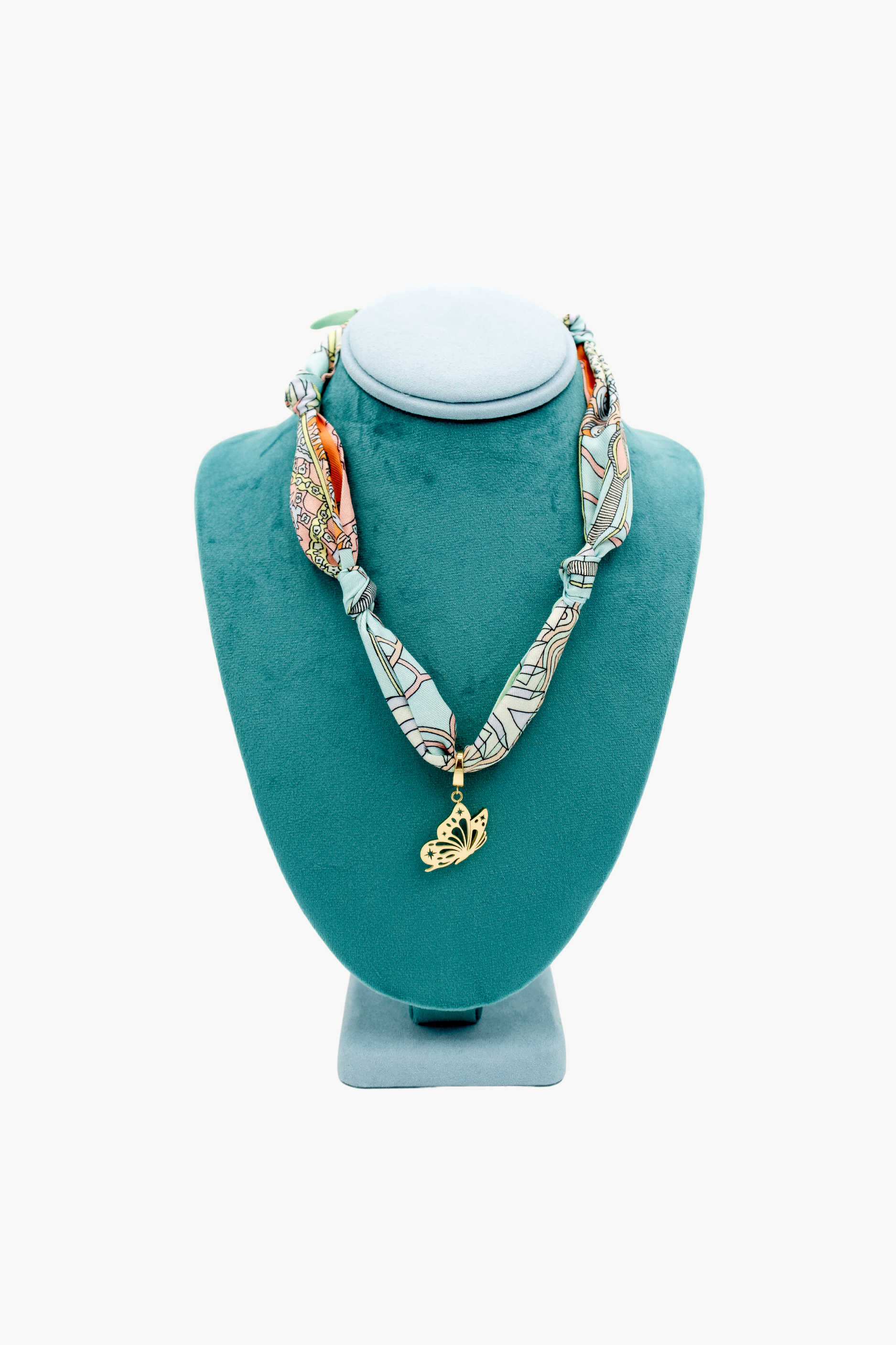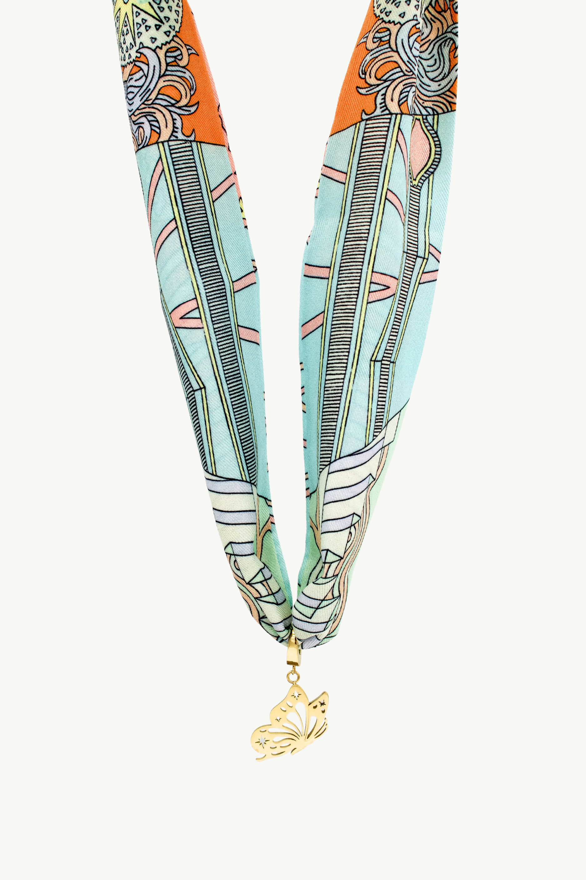 Pale blue, soft green, peach, a whisper of orange, and a dash of yellow - The Venice is like gliding down the Grand Canal on a silk gondola. These breezy hues channel sunlit piazzas, clinking Aperol glasses, and the kind of effortless romance only Italy can pull off. When wearing this necklace, you can imagine yourself arriving at a masked ball - because with The Venice, every day is Carnevale for your wardrobe. Wear it knotted or unknotted with you favorite charm or charms, and let The Venice deal you a hand full of style. This narrow 35" long scarf necklace is made with lightweight emulsion silk and is soft and breathable.